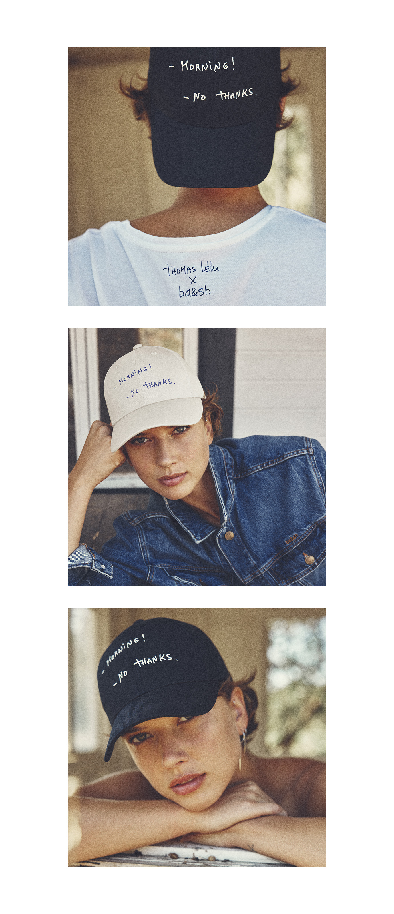 Optimism, humour, irreverence and imagination – we’ve got all that in store for you this summer. For our latest collaboration, we have set our sights on the enfant terrible of the art world: artist, photographer, writer and set designer, Thomas Lélu, is what you might call a hyperactive creative. Armed with his ballpoint pen, Thomas set aside his usual medium of paper for a while to turn his attention to ba&sh’s rails. The result? Three loose-fit, boyish t-shirts and two caps sporting original and outspoken messages.